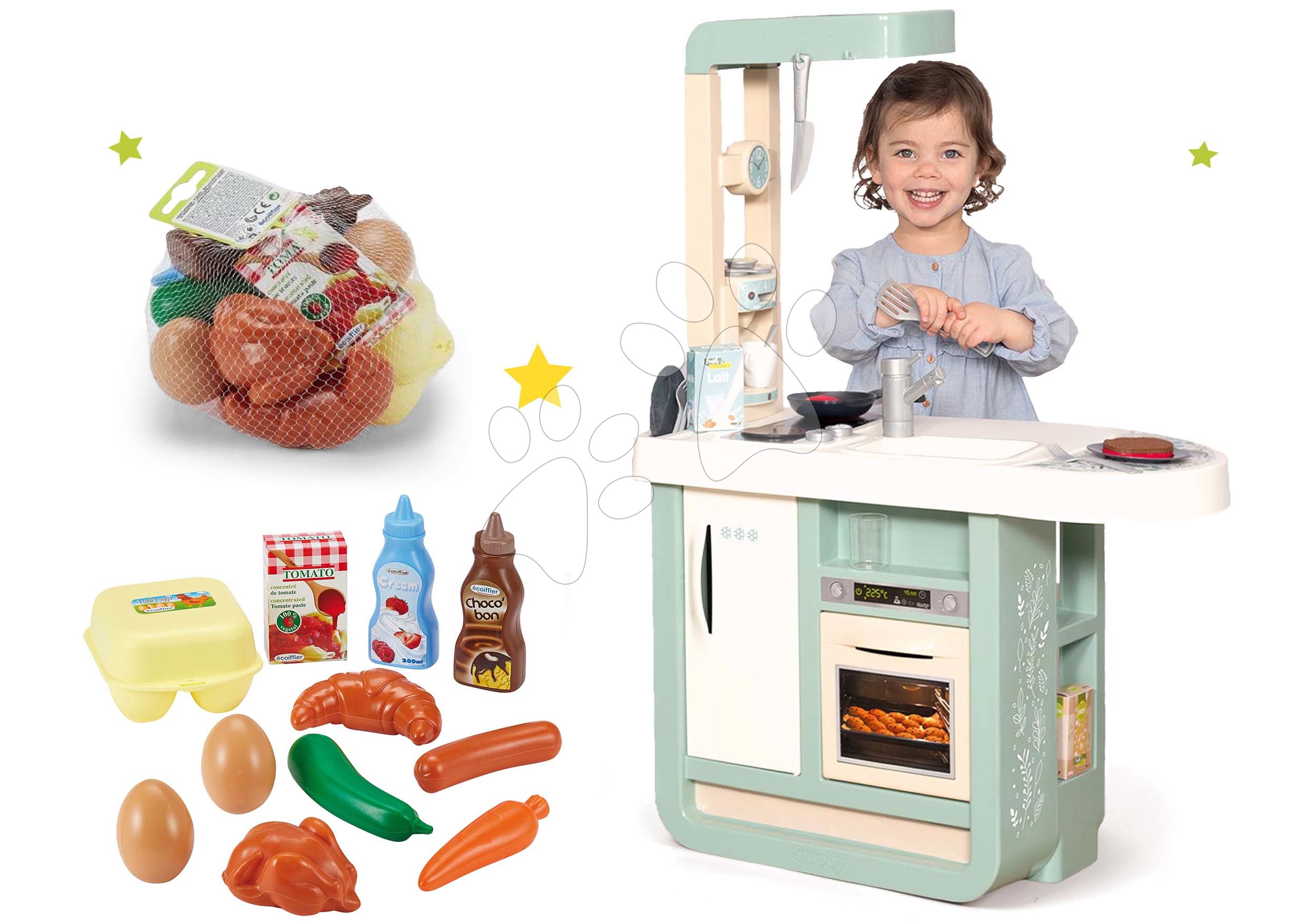 Set hračiek kuchynka Cherry Kitchen a súprava potravín je fantastická sada hračiek pre malých výmyselníkov. Detská kuchynka je vhodná od 3 rokov, sada potravín od 18 mesiacov. Tieto úžasné hračky pochádzajú od spoľahlivých francúzskych výrobcov Smoby a Écoiffier. V ich hračkách sa spája francúzsky šarm s rokmi overenou kvalitou a bezpečnosťou počas hier vašich ratolestí. Realistický dizajn a prepracované detaily kuchynky zaručene upútajú každé dieťatko. Detská súprava potravín sa vďaka veselým farbám veľmi rýchlo stane obľúbenou hračkou vašich najmenších.
