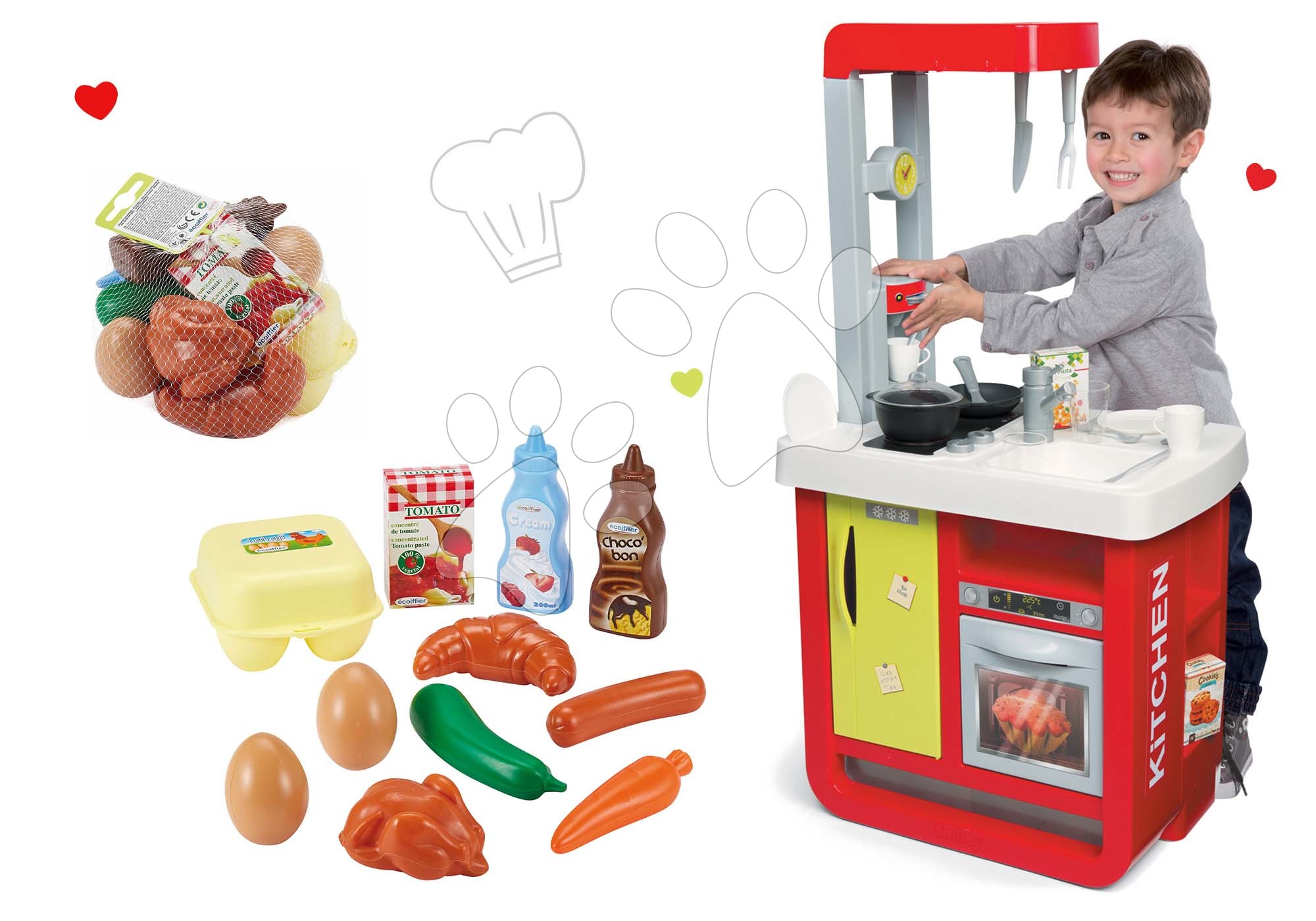 Set hračiek kuchynka Cherry Special a súprava potravín je fantastická sada hračiek pre malých výmyselníkov. Detská kuchynka je vhodná od 3 rokov, sada potravín od 18 mesiacov. Tieto úžasné hračky pochádzajú od spoľahlivých francúzskych výrobcov Smoby a Écoiffier. V ich hračkách sa spája francúzsky šarm s rokmi overenou kvalitou a bezpečnosťou počas hier vašich ratolestí. Realistický dizajn a prepracované detaily kuchynky zaručene upútajú každé dieťatko. Detská súprava potravín sa vďaka veselým farbám veľmi rýchlo stane obľúbenou hračkou vašich najmenších.