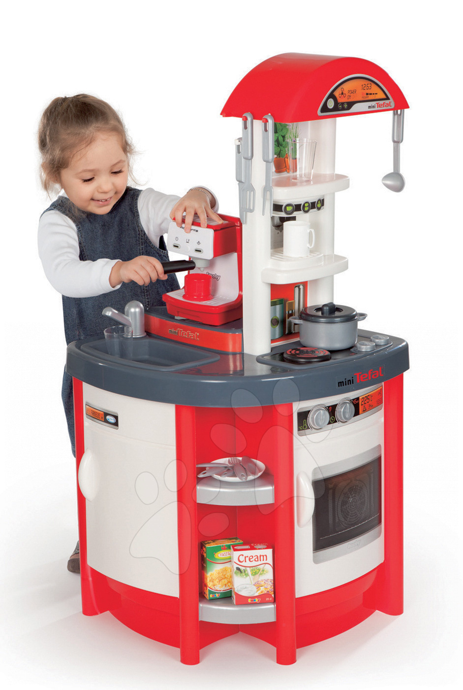 Kuchynka má množstvo úložného priestoru, vďaka čomu sa jednotlivé doplnky nestratia a sú pekne uložené. Kuchynka pre deti Studio Tefal je vysoká 99 cm. K vybaveniu kuchynky patrí rúra na pečenie, platnička na varenie a množstvo príslušenstva. Spolu kuchynka obsahuje až 19 kusov doplnkov. Patria k nim poháre, príbor, taniere, hrnce a potraviny. K doplnkom kuchynky patrí aj kávovar Espresso Rowenta. Červeno-biela kombinácia farieb je veľmi moderná. Výhodou kuchynky je to, že je prístupná zo všetkých troch strán.