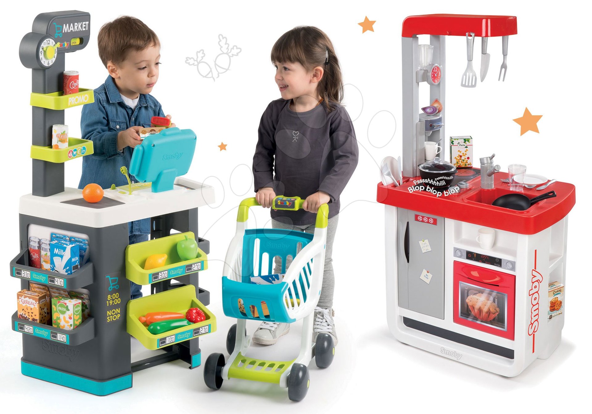 Set hračiek detský obchodík Market a červeno-strieborná kuchynka Bon Appétit spolu predstavujú jednu veľkú súpravu zábavných hračiek, ktorá je vhodná pre všetky deti od 3 rokov. Tieto hračky pochádzajú z dielne francúzskeho výrobcu Smoby, ktorý sa už dlhé roky pýši výrobou kvalitných a bezpečných hračiek s originálnym dizajnom. Kuchynka aj obchod pre deti v sebe zahŕňajú veľa doplnkov, ktoré robia hru na predavačov a kuchárov veľmi realistickou. Hračky v tomto sete ponúkajú naozaj široké spektrum hier, pri ktorých sa deti nielen zabavia, ale môžu sa aj veľa naučiť. Učia sa o význame a dôležitosti povolaní dospelých. Práve kvôli širokému využitiu nesmú tieto hračky chýbať ani vo výbave vášho dieťatka.