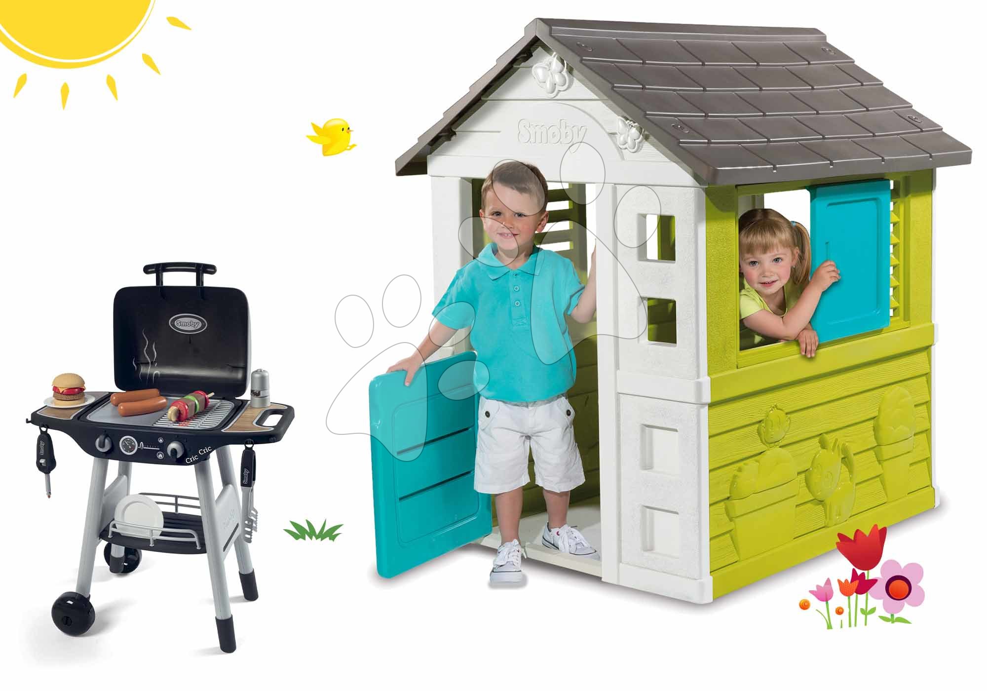 Set hračiek domček Pretty New a gril Barbecue s mechanickými funkciami je dokonalý set hračiek pre všetky deti od 2 rokov. Set hračiek ponúkame za akciovú cenu, vďaka čomu ušetríte a získate pre deti originálne hračky. Hračky v sete spolu krásne ladia, sú vyrobené z kvalitného materiálu a výborne zapadnú do každej záhrady. Hračky od francúzskeho Smoby si obľúbia chlapci aj dievčatá.