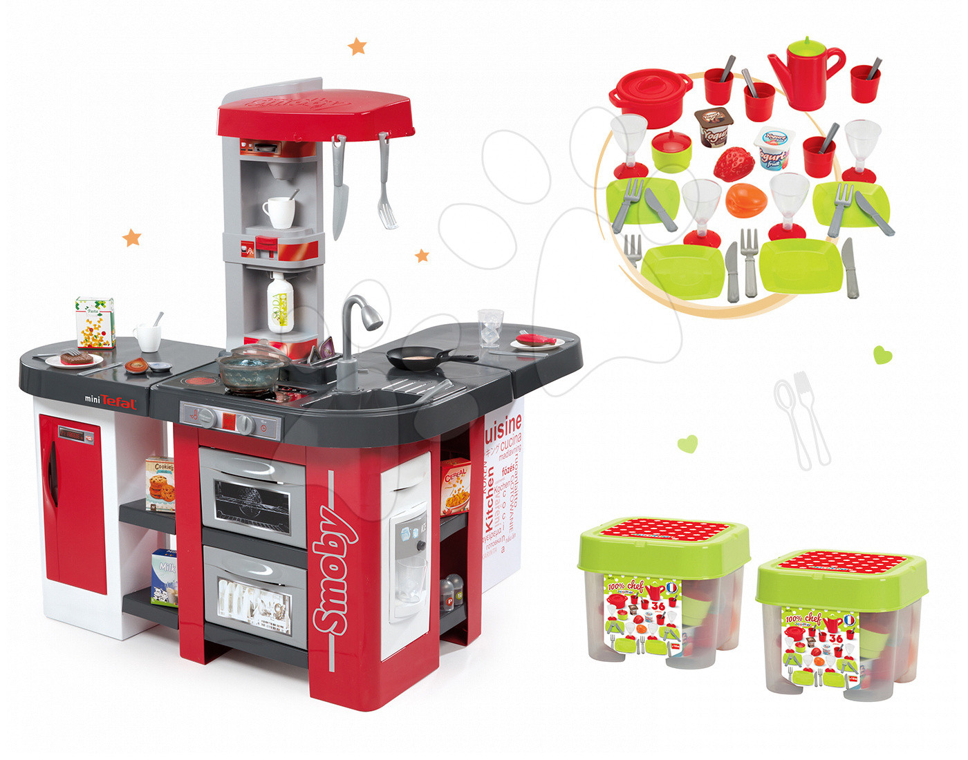 Set Smoby a Écoiffier tvoria jedinečné hračky: elektronická kuchynka Tefal Studio XXL a obedová súprava 100% Chef. Sú to krásne a kvalitné hračky od francúzskych výrobcov vhodné pre chlapcov aj dievčatá. Realistické detaily a originálny dizajn kuchynky s magickým bublaním sa výborne dopĺňa s obedovou sadou, ktorá do kuchynky dokonale zapadne. Sadu 2 hračiek vám ponúkame v zvýhodnenej cene. Potešte svojich malých kuchárov sadou hračiek, s ktorou sa zabavia dlhé hodiny.