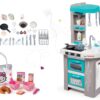 Nad pracovnou doskou kuchynky sa týči stojan, na ktorom je zakomponovaný espresso kávovar s náhradnými kapsulami a rôznymi príchuťami. Nad ním sú kuchynské hodiny, ktoré nesmú chýbať v žiadnej správnej kuchyni a v hornej časti sú držiaky na kuchynské náradie. Ku kreatívnym doplnkom kuchynky patrí hrniec s pokrievkou, taniere s príbormi, poháre, šálky na kávu, náhradné kapsuly do kávovaru, kuchynské náradie, panvica, cookies a cestoviny. Detská kuchynka Smoby má množstvo úložných priestorov a vďaka svojej kompaktnej veľkosti sa zmestí do každej detskej izbičky.