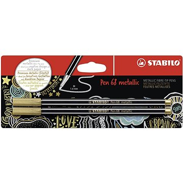 Popisovače STABILO Pen 68 metallic, 2 ks, zlaté, v blistri:Kľúčové prednosti popisovačov STABILO Pen 68 metallic, 2 ks, zlaté, v blistri Popisovače STABILO patria medzi písacie aj výtvarné potreby Šesťhranný tvar ponúka pohodlnú manipuláciu Sú určené na papier Typ farby: atramentová Fixky STABILO sú ideálne od 6 rokov Guľatý hrot popisovačov zanechá stopu so šírkou 1,4 mm Zamazanie od popisovačov je možné z oblečenia vyprať Metalický efekt pritiahne pozornosť V balení očakávajte 2 fixky STABILO Farba náplne: zlatá