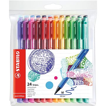Linery STABILO point Max, 24 ks, puzdro:Zásadné prednosti produktu STABILO point Max puzdro 24 fariebLinery STABILO sú písacou aj výtvarnou pomôckouIdeálna k rôznym druhom tvoreniaMožno ich využiť na papierTrojhranný tvar príjemne padne do rukyTyp farby: atramentováMajú okrúhly tvar hrotu, ktorý zanecháva stopu širokú 0,8 mmVďaka svojmu tenkému hrotu nachádza uplatnenie najmä pri rysovaní a obkresľovaní šablón Medzi ich výhody patrí rýchle schnutieLinery STABILO sú ideálne od 6 rokovV balení je obsiahnutých 24 kusovFarba linerov STABILO: modrá, zelená, čierna, červená, žltá, hnedá, oranžová, fialová, ružová, tyrkysová, sivá a béžová