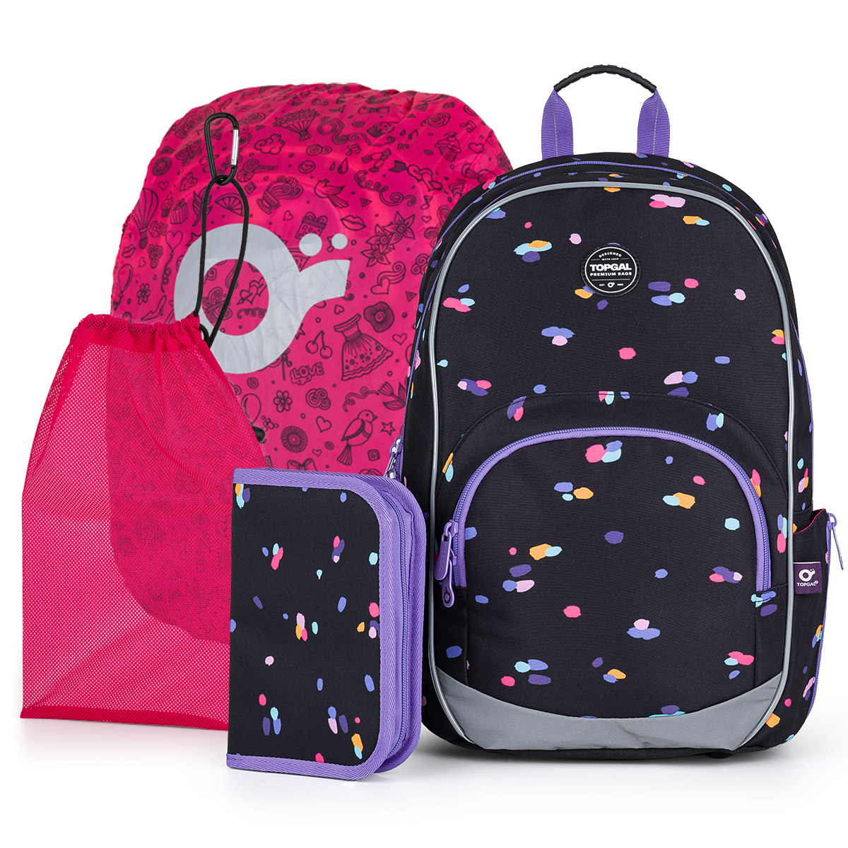 Zvýhodnený set školskej tašky s peračníkom, vrecúškom na prezuvky a nepremokavou pláštenkou. Súčasťou setu sú tieto produkty: KIMI 24010 – Školská taška bodky, PENN 24010 – Dvojito skladaný školský peračník, ZUZA 19045 – Vrecko na prezuvky, ZIGI 17002 – Pláštenka na batoh