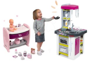 Set postieľka k posteli s prebaľovacím pultom Violette Baby Nurse 2v1 Smoby s cikajúcou bábikou a kuchynka Tefal Studio Bubble elektronická s doplnkami