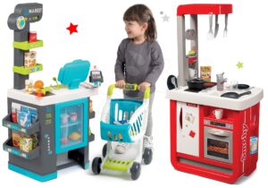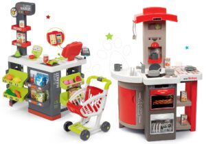 Set obchod s chladiacim boxom Fresh City Market Smoby s elektronickou pokladňou a kuchynka rastúca s tečúcou vodou Tefal Evolutive