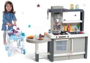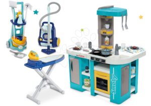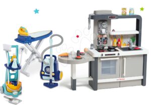 Set kuchynka rastúca s tečúcou vodou Tefal Evolutive Smoby a upratovací vozík so žehliacou doskou