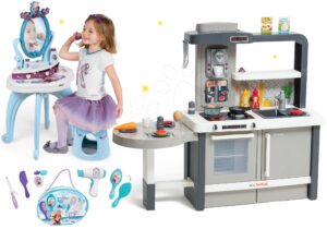 Set kuchynka rastúca s tečúcou vodou Tefal Evolutive Smoby a kozmetický stolík Frozen 2v1 so stoličkou a taštičkou