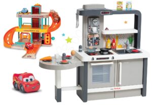 Set kuchynka rastúca s tečúcou vodou Tefal Evolutive Smoby a poschodová garáž s autíčkom Vroom Planet Cars