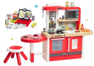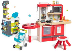 Set kuchynka skladacia Tefal Opencook Smoby červená s kávovarom a chladničkou a obchod Supermarket s elektronickou pokladňou