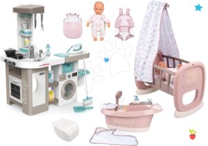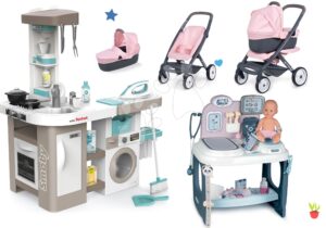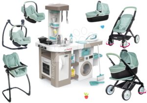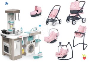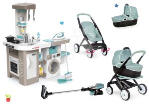 Set kuchynka elektronická s práčkou a žehliacou doskou Tefal Cleaning Kitchen 360° Smoby a kočík s jedálenskou stoličkou autosedačkou a hojdačkou