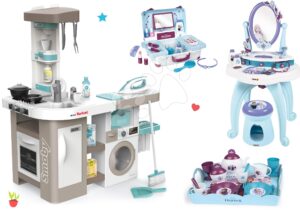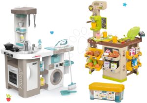 Set kuchynka elektronická s práčkou a žehliacou doskou Tefal Cleaning Kitchen 360° Smoby a obchod Bio Fresh Market s veterinárskym kufríkom