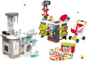 Set kuchynka elektronická s práčkou a žehliacou doskou Tefal Cleaning Kitchen 360° Smoby a obchod s elektronickou pokladňou a potraviny s riadíkom