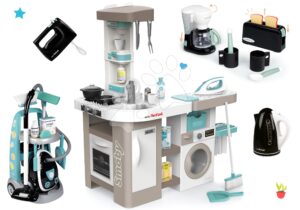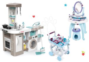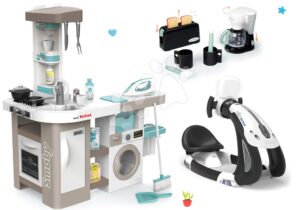 Set kuchynka elektronická s práčkou a žehliacou doskou Tefal Cleaning Kitchen 360° Smoby a upratovací vozík s mixérom a raňajkový set s rýchlovarnou kanvicou