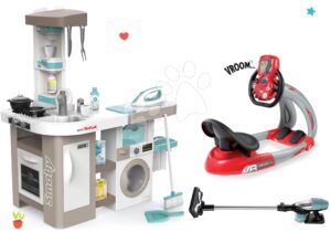 Set kuchynka elektronická s práčkou a žehliacou doskou Tefal Cleaning Kitchen 360° Smoby a trenažér elektronický V8 Driver a tyčový vysávač
