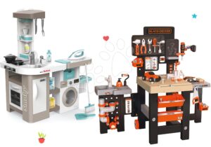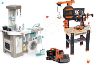 Set kuchynka elektronická s práčkou a žehliacou doskou Tefal Cleaning Kitchen 360° Smoby a pracovný stôl so žeriavom a kamión s kufríkom a náradím
