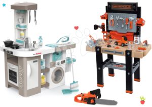 Set kuchynka elektronická s práčkou a žehliacou doskou Tefal Cleaning Kitchen 360° Smoby a pracovná dielňa elektronická s autíčkom a motorová píla so zvukom