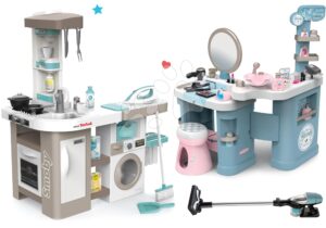 Set kuchynka elektronická s práčkou a žehliacou doskou Tefal Cleaning Kitchen 360° Smoby a kozmetický stolík elektronický a vysávač so zvukom