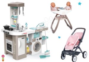 Set kuchynka elektronická s práčkou a žehliacou doskou Tefal Cleaning Kitchen 360° Smoby a kočík pre dvojičky s jedálenskou stoličkou